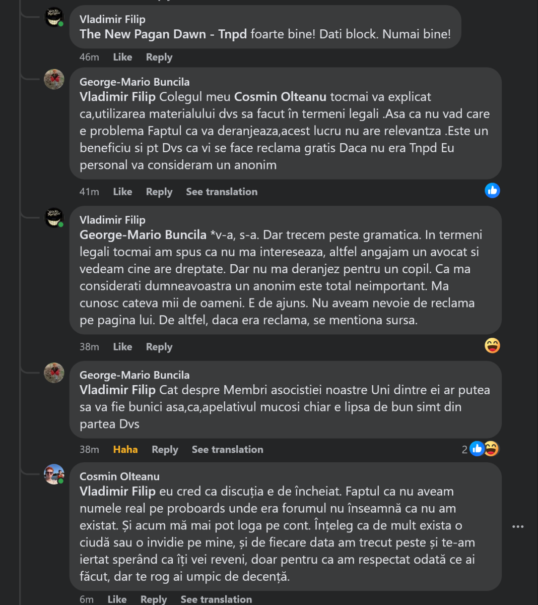 Anii au trecut, el și-a văzut de ale lui iar eu mi-am văzut de ale mele. Totuși, nu mai țin minte cum (pentru că nu i-am citit niciodată site-ul) am descoperit că acesta a copiat, fără acordul meu și fără ca eu să știu, de pe site-ul și forumul meu, cât și de pe site-ul Biserica Satanista. Astfel că i-am întrebat de ce mi-au copiat materialul. Pozele din galeria de mai jos sunt printscreen-uri de la prima discuție pe această temă.