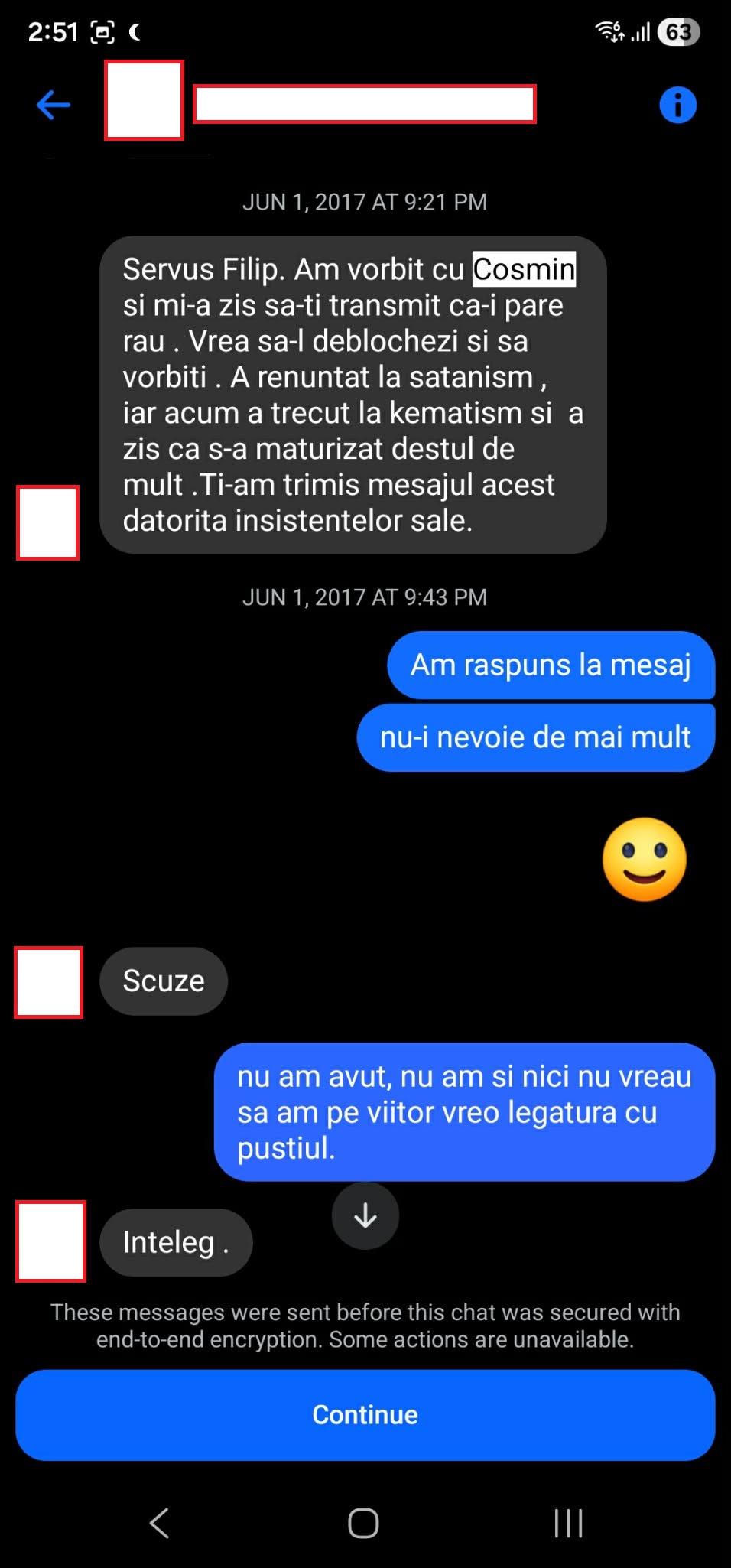 Cosmin/Emrys a încercat încă din 2017 să colaboreze cu mine și să fim prieteni, însă nu l-am acceptat niciodată. Cu toate acestea, a continuat. Vă las mai jos parte dintr-o discuție cu Cosmin din Iunie 2017.