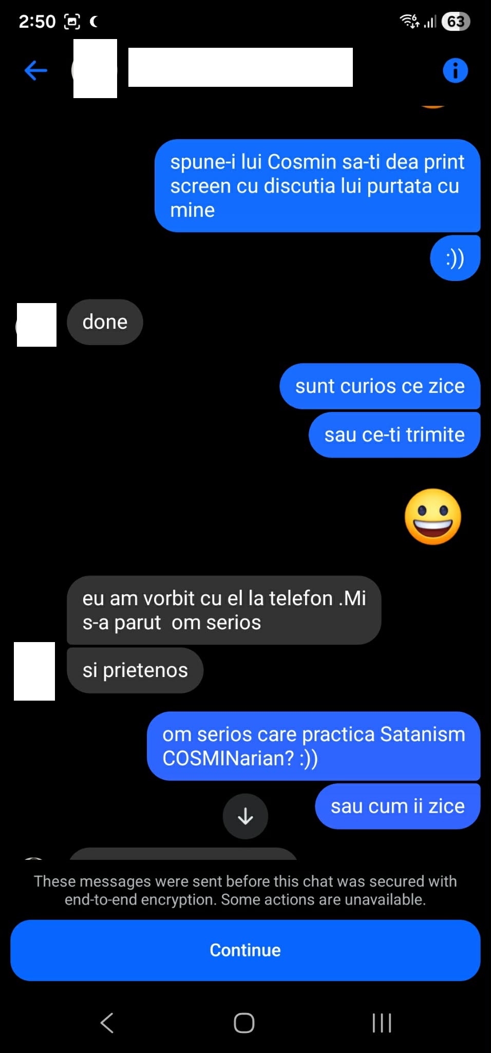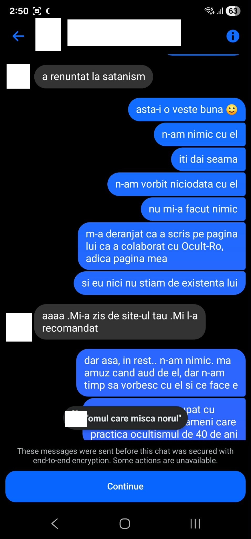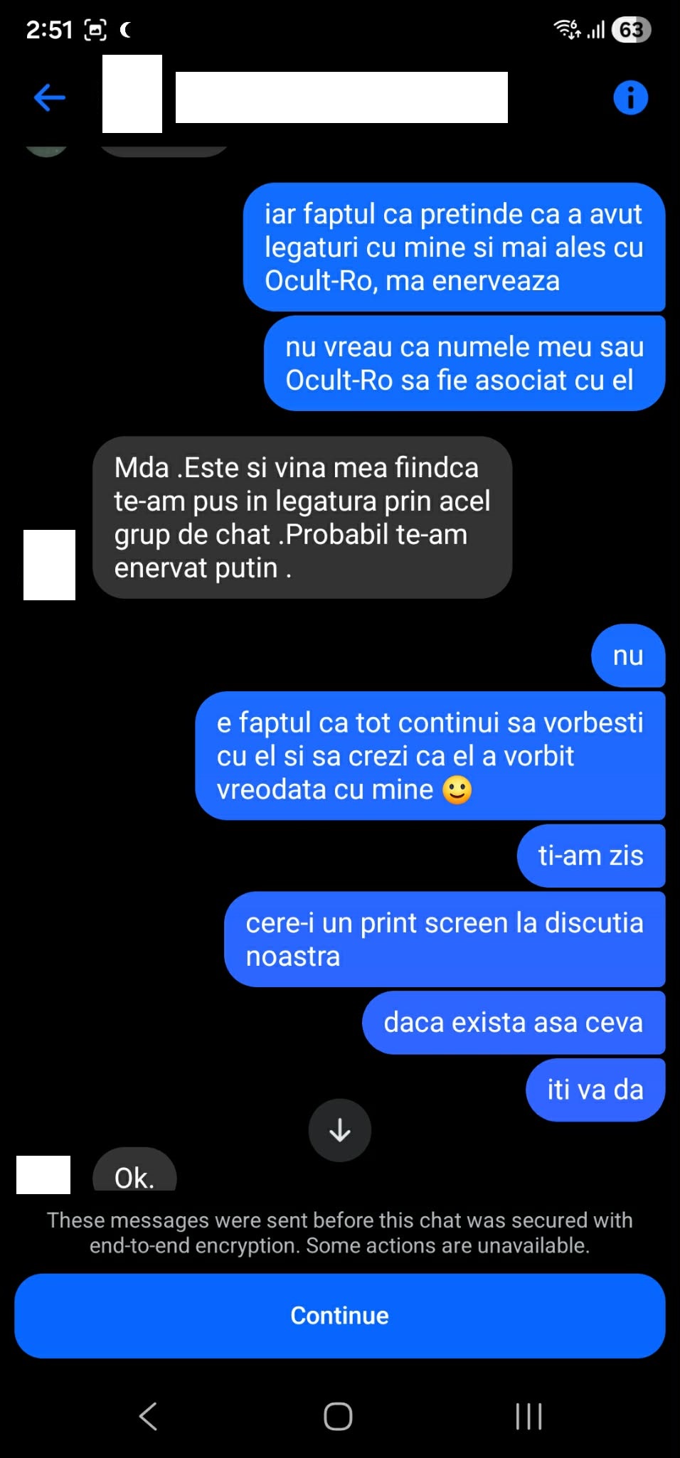 Edit: Am mai găsit niște discuții care arată că acesta încerca să ia legătura cu mine. Pentru protecția persoanei cu care am purtat acele discuții și respectarea cererii sale de anonimat, am cenzurat numele său în printscreen-uri. Discuția este din 29 Mai 2017.