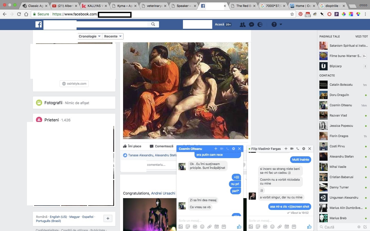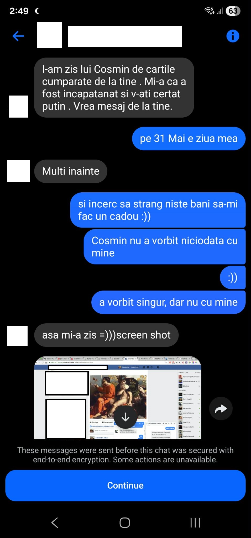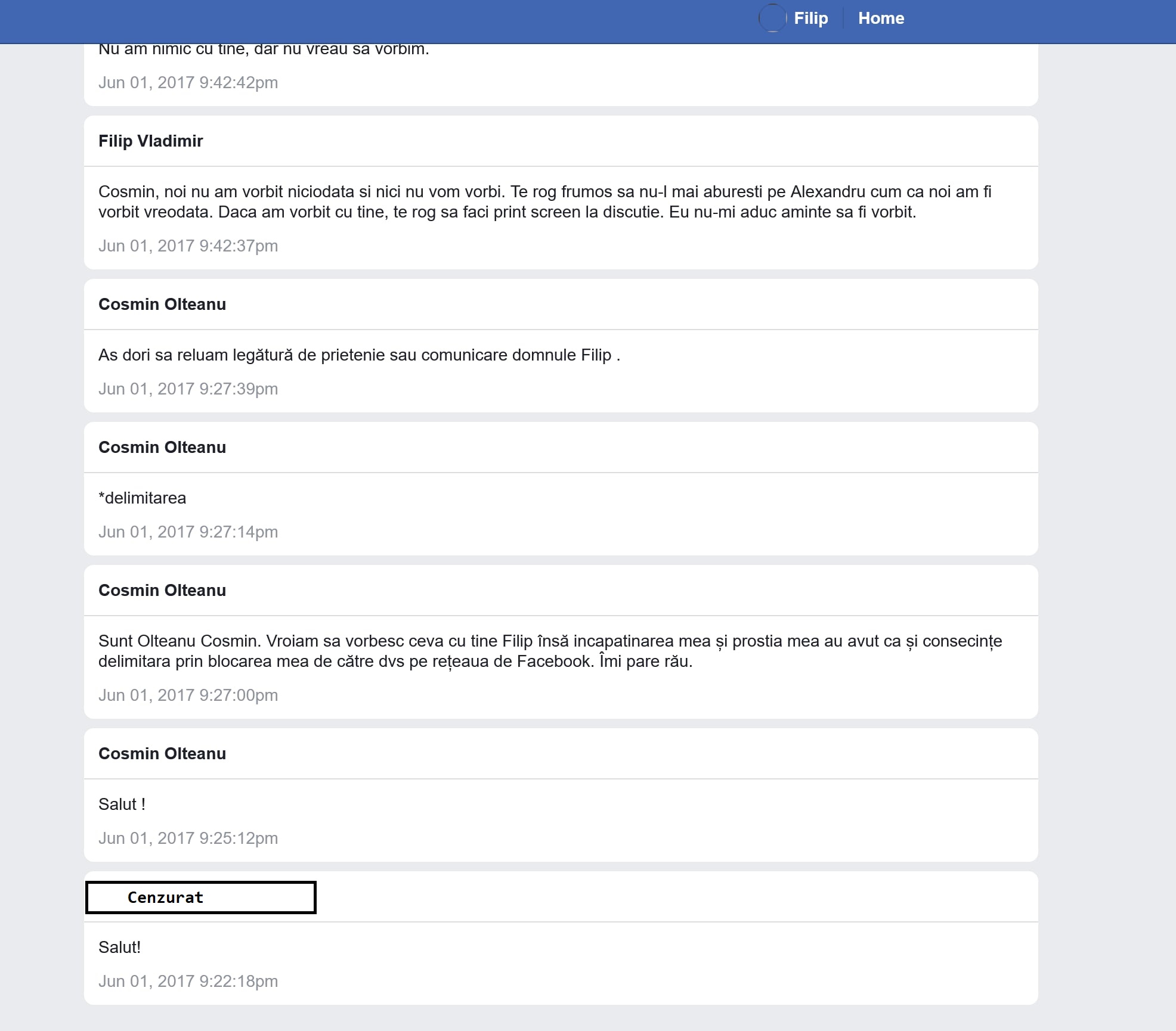 Edit: Inițial am urcat aici chiar fisierul cu discuția de mai jos, însă pentru a proteja anonimatul persoanei care ne-a pus în legătură, am șters fișierul preluat dintr-un Facebook backup și voi oferi doar printscreen-uri în care cenzurez numele celeilalte persoane. Voi prezenta fișierul original numai în fața legii. Din pacate ordinea mesajelor este de jos în sus (nu știu de ce). Este unul din vechile sale conturi care era la adresa https://www.facebook.com/pscosmin
