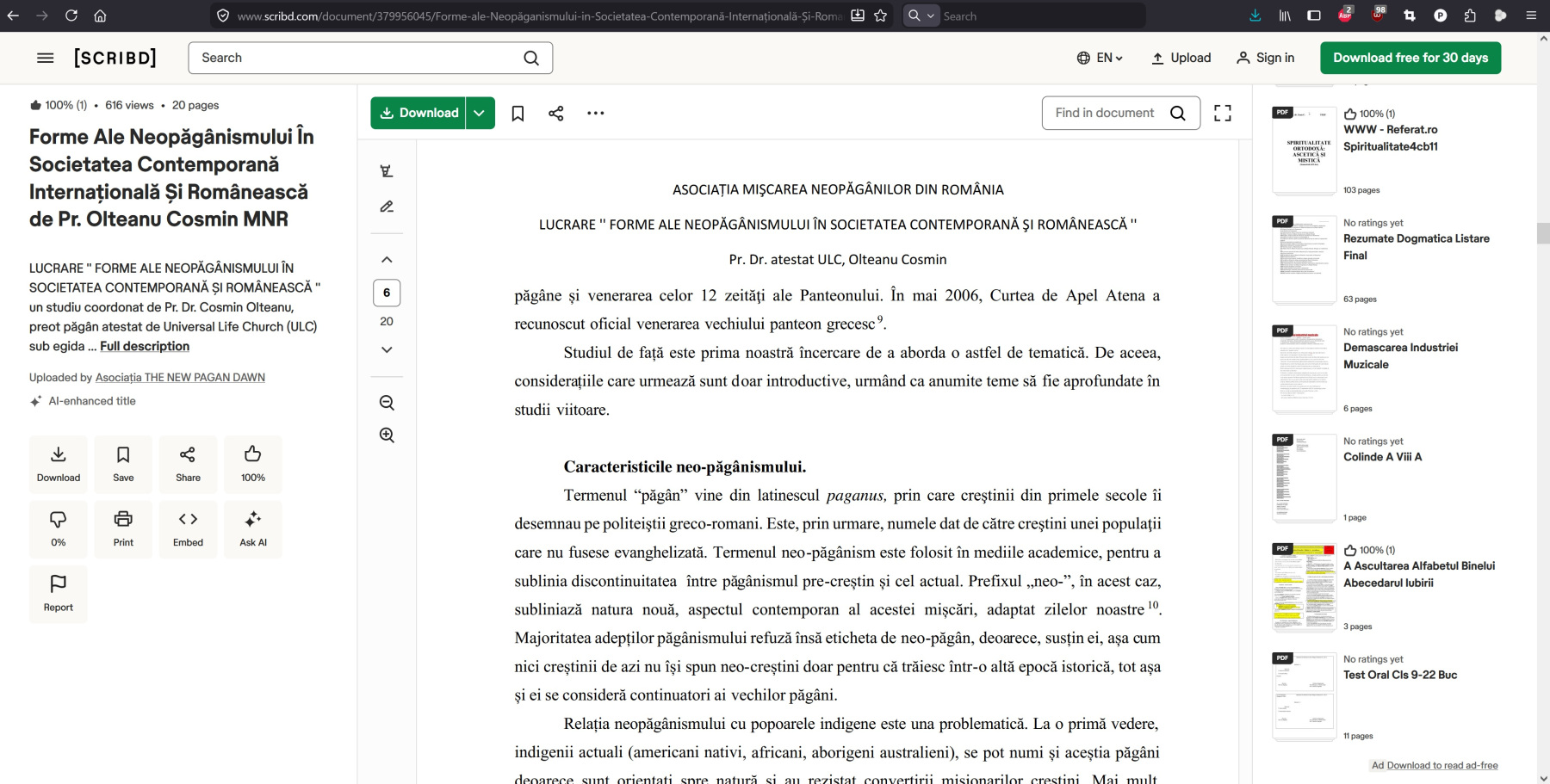 - descrierea caracteristicilor generale ale neopăgânismului.