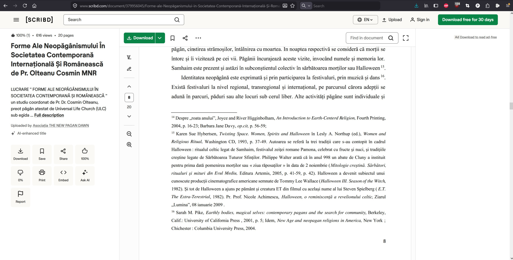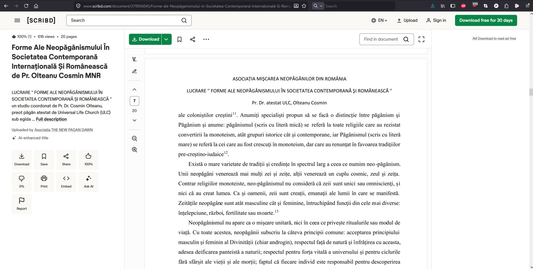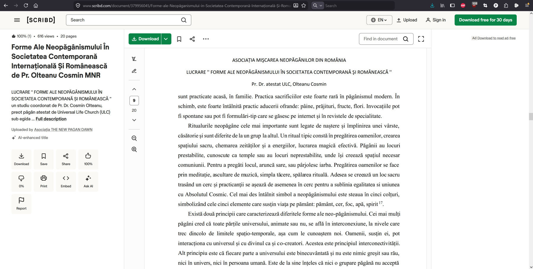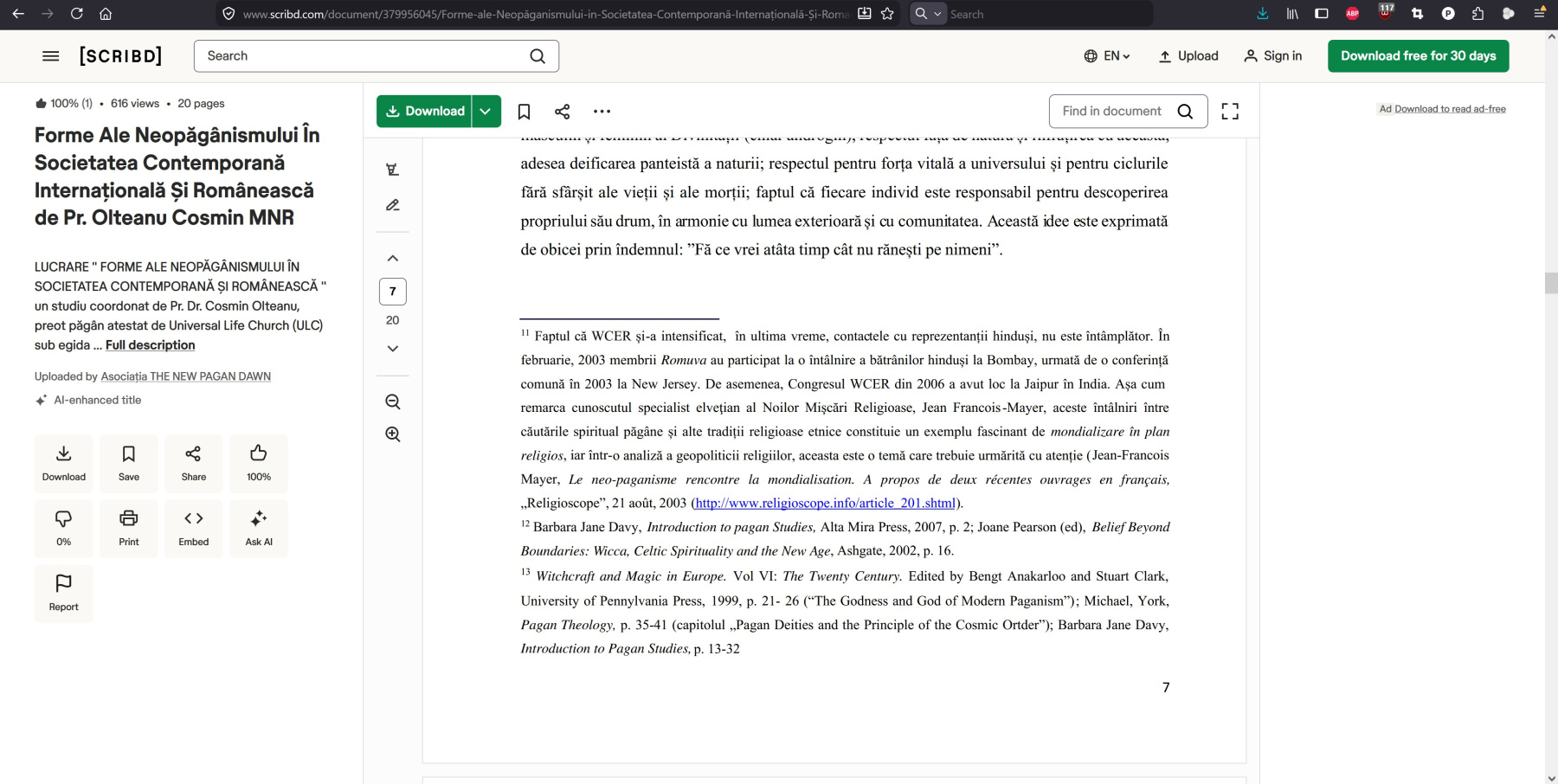 - introducerea și contextualizarea neopăgânismului în România;
